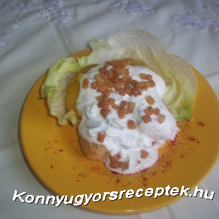 A salátalevéllel megágyaztam a burgonyáknak, majd nyakon öntöttem őket a tejfölös masszával és ennek a tetejére szórtam a szalonna darabkákat és egy pici őrölt pirospaprikával próbáltam még étvágygerjesztőbbé tenni.