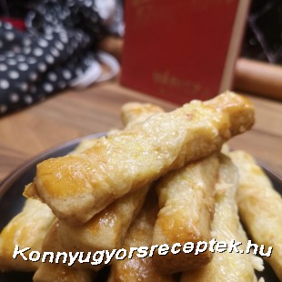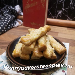 2. Lisztezett deszkán kinyújtjuk és mutatóujjunk használjuk mércének: felszeleteljük a kinyújtott tésztát úgy, hogy ujjnyi vastag, ujjnyi magas és ujjnyi hosszú csikokat kapjunk belőle, majd bélelt tepsire helyezzük őket úgy, hogy egy ujjnyi helyet hagyjunk közöttük. Ezután kettőt hármat nyomunk az oldalain hogy hullámos formájúak legyenek a rudacskáink.
