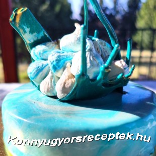 6. A mousset kivesszük a fagyasztóból, rácsra tesszük, a rács alá tepsit teszünk és finoman, lassan lehúzzuk a szilikon formát róla. Egy edénybe beleöntjük a kék glazúr negyedét, majd a csillámos glazúr negyedét a közepébe csorgatjuk. Ezután újra kék, majd újra csillámos, míg el nem fogy a glazúrunk. Ezután ezt a keveréket közepétől indulva rácsorgatjuk a moussera körkörös mozdulatokkal. Hamar fog megdermedni a langyos glazúr a jéghideg mousseon, így amint lecsepegett róla az utolsó csepp felesleg is gyorsan áttesszük a rácsról a felszolgálásra szánt tálcára és hűtőbe tesszük.