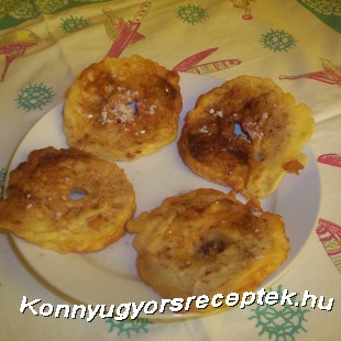 Én 1 db almát 5 felé szoktam vágni, kb. 5 szeletre, fél cm-nyi vastagságúra. Van, aki nem szokta meghámozni az almákat, ez teljesen egyéni.Következő lépésben az almaszeleteket beleforgatom a palacsintatésztába – előtte már az olajat felforrósítottam –, és benne szép aranyszínűre sütöm meg az almák mindkét oldalát, majd szalvétára, konyhai kéztörlőre kiszedem és fogyasztás előtt tetejüket őrölt fahéjjal megszórtan tálalom.