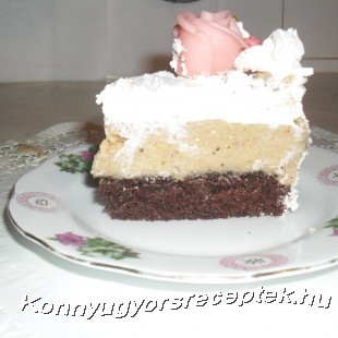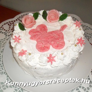 A vízben a fele porcukorral megfőzzük a pudingot, kihűtjük. A vajat a maradék cukorral kikeverjük, hozzáadjuk a kihűlt pudingot, majd az áttört gesztenyét, rumot. Egynemű krémmé keverjük. A formába visszatett lapra kenjük, a tejszínt keményre verve a tetejére simítjuk, hagyunk belőle egy keveset az oldalára és a tetejére. Tetszés szerint díszíthető. Marcipánnal, vagy nyújtható cukormázból formákat vághatunk ki. ( én most babakocsival díszítettem)