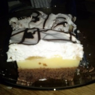 Rásimítjuk a piskótára, majd miután kihűlt rákarikázzuk a banánt. A tejszínt a habfixálóval keményre felverjük, majd a süteményre simítjuk. Csokisziruppal meglocsoljuk, majd hűtőbe tesszük.