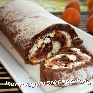 A főzőtejszínt, a zsíros túrót, a cukrot, a zselatint és a pálinkát összekeverjük. A tölteléket a piskótalapra kenjük úgy, hogy azon a végén, amely felgöngyölés után a tekercs aljára kerül, egy 4 cm-es sávot üresen hagyunk. A friss barackokat leforrázzuk, lehúzzuk a héjukat, majd félbevágjuk és kimagozzuk őket. Ha kompótot használunk, jól lecsöpögtetjük. A barackokat feldaraboljuk és a túrókrémre szórjuk.