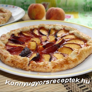 Rárakjuk a barackszeletek felét, ráhajtjuk a tészta peremét, és a széleit lekenjük tojással. Sütőpapírral fedett tepsire helyezzük.