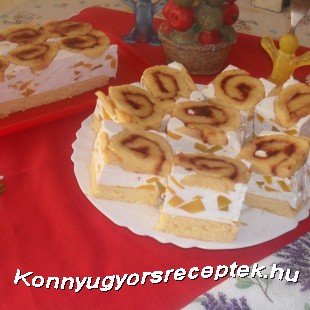 A kihűlt tekercseket megkenjük lekvárral, feltekerjük. A tepsibe sütőpapírt teszünk, A szeletekre vágott piskótatekerccsel kirakjuk az alját. A krémet rá simítjuk, majd rátesszük a piskóta lapot. fóliával " lenyomjuk" ( akár egy vékonyabb vágó deszkát is ráteszünk), egy éjszaka hűtőbe tesszük. Másnap tálcát borítunk rá, és átfordítjuk, így a tekercsek felülre kerülnek. Kockára vágva tálaljuk.