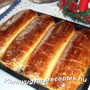 Négy cipóra osztjuk, mindegyiket megkenjük töltelékkel,és felcsavarjuk, zsírozott tepsibe helyezzük.