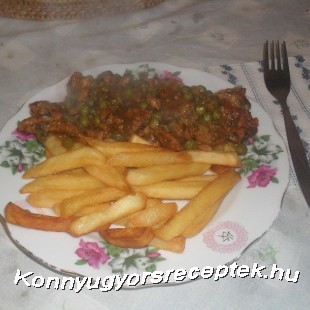 A szalonnát, és a húst csíkokra vágjuk. A szalonnát kisütjük, rádobjuk a csíkozott húst, és együtt tovább pirítjuk. A borsót megfőzzük, a levét félretesszük. A lepirult húshoz adjuk a kockára vágott kétfajta hagymát, a lecsó alapot, összeforgatva dinszteljük. Sózzuk, borsozzuk. Hozzáadjuk a sűrített paradicsomot, és annyi borsó lével öntjük fel, amennyi éppen ellepi. lassan puhára dinszteljük. Hozzáadjuk a megfőtt borsót, még pár percet összefőzzük, megszórjuk aprított petrezselyemmel, utána ízesítjük. Bármilyen körettel tálaljuk. Én most sült krumplival tálaltam.