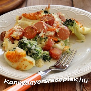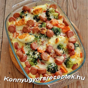 Egy jénaitálat (v. tepsit) kenjük ki a vajjal, szórjuk bele az előzőleg megfőzött brokkolit, majd pakoljuk rá a roppanósra főzött sárgarépa és a virsli karikákat, valamint a cikkekre vágott főtt tojást.