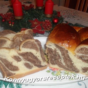 Kevés langyos tejben felfuttatjuk az élesztőt. A száraz hozzávalókat ? a kakaó kivételével- összekeverjük, hozzáadjuk a felfuttatott élesztőt, összegyúrjuk, a vége felé hozzáadjuk az olvasztott vajat. Sima egynemű tésztává dagasztjuk. Kelesztjük. Ha megkelt kétfelé vesszük, az egyik feléhez hozzágyúrunk 1 kanál tejjel összekevert 2 kanál kakaót. Kicsit pihentetjük. A fehér tésztát 3 fele vesszük, kinyújtjuk. A kakaós tésztát 6 fele osztjuk, hosszú rudat sodrunk belőle, és 2-2 rudat a kinyújtott fehér tésztára teszünk. Feltekerjük, mint a bejglit, és a 3 szálat összefonjuk. Sütőpapírral bélelt tepsibe ( dobozba) tesszük, és ismét duplájára kelesztjük. Ha megkelt megkenjük a tetejét tojással, és 180 C fokos sütőben szép pirosra sütjük. ( kb. 40 perc alul-felül sütés) . Még melegen megkenjük meleg olvasztott vajjal, majd letakarva kihűtjük.