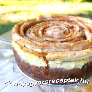 6. A sajttortánkat kivesszük a hűtőből, késsel finoman végigmegyünk a torta és a forma fala között, majd leemeljük róla a kapcsos formát. A fahéjas csigát finoman tányérra borítjuk, majd onnan átfordítjuk a torta tetejére. Kicsit egyengethetünk rajta hogy illeszkedjen a torta széléhez.