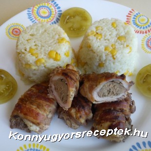 A csirkemellet vékonyra szeleteljük enyhén sózzuk, borsozzuk, majd egy-egy májat a hússzeletek közepére helyezünk, feltekerjük, és egy-egy szelet bacon szalonnába göngyöljük.