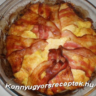 - Egy jénai tálat kibélelek baconnal. A bacon úgy legyen hogy legyen annyi túllógó rész hogy a végén rá lehessen hajtani a szalonnát a megtöltött tálra.