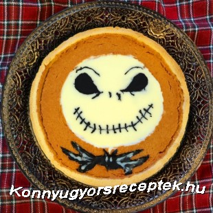 7. A kihűlt tésztára kanalazom a sütőtök krémet. Előmelegített sütőben 180 fokon további 30 percig sütöm, majd hagyom kihűlni. Ha kihűlt, kör alakban kb 2 centi mélyen kanállal egyenletes mélyedést készítek és a kör alatt egy nyakkendő formát vájok ki.
