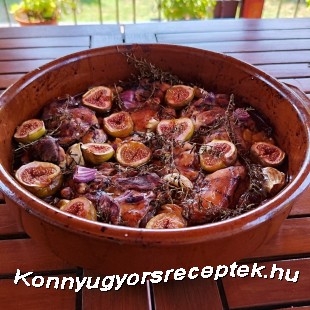 3. Egy sütőtálat kikenünk az olivaolajjal, majd szépen elrendezzük bennne a húst az elnegyedelt lilahagymával, a fokhagymákkal, az elfelezett fügékkel és a friss kakukkfű ágakkal, majd egy kiskanálnyi mézzel meglocsoljuk.