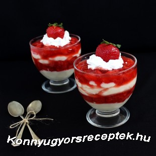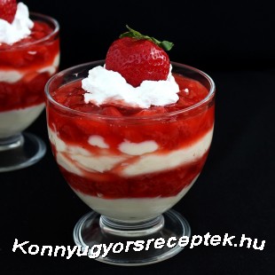 Az elkészült vaníliás pudingot az eperzselével váltakozva kanalazzuk bele a poharakba, majd tegyük be a hűtőbe, hogy kellően megdermedjen, és az ízek összeérjenek.