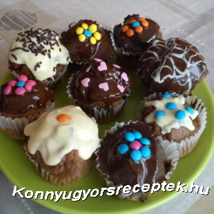 Gőz fölött olvasszuk fel a csokoládékat. A muffinokat mártsuk bele az étcsokoládéba, vagy tetszés szerint a fehércsokoládéba, majd díszítsük őket cukorkákkal.