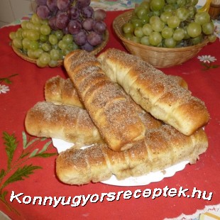 Az élesztőt felfuttatjuk, majd a többi hozzávaló hozzáadásával lágyabb, ruganyos tésztát dagasztunk. ( a meleg vajat a dagasztás végén, apránként adjuk hozzá). Meleg helyen duplájára kelesztjük. Ha megkelt 12 részre vágjuk, gombócokat gyúrunk , letakarva kicsit pihentetjük. Kb. 30x12 cm téglalappá nyújtjuk, a felénk eső hosszabbik oldalon az alsó harmadon 1 centiméterenként bevagdossuk a tésztát. A felső részt olvasztott vajjal megkenjük, megszórjuk fahéjas cukorral, és óvatosan feltekerjük ( magunk felé) , a bevagdosott rész felülre kerül. Sütőpapírral bélelt tepsibe téve ismét kelesztjük. 180 C fokos sütőben ( alsó -felső sütés) kb. 15-17 perc alatt szép rózsaszínre sütjük. Még melegen megkenjük olvasztott vajjal, és megszórjuk fahéjas cukorral.