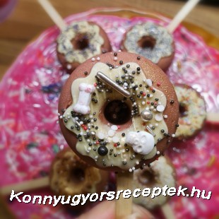 2. A tejcsoki felét megolvasztjuk és kikenjük vele a fánk formáink, beleértve a fehér részt is. Ügyeljünk rá, hogy a formák közepén lévő kiemelkedést is vonjuk körbe. Ollóval pici bemetszést ejtünk mind a hat fánk formánk oldalán és mielőtt elkezdene megkötni a tejcsoki, beledugunk egy-egy pálcikát a közepéig. 10 percre visszatesszük a fagyasztóba.
