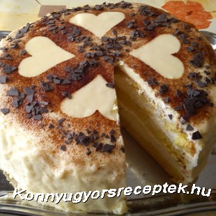 A margarint a porcukorral és a tojássárgákkal habosra keverjük, majd a kihűlt pudinggal vegyítjük. A krémsajtot és habbá vert tejszínhabot óvatosan hozzákeverjük, majd az elkészült krémmel a torta lapjait megtöltjük, valamint a külső részét is befedjük vele. A fehér csokoládét gőz fölött megolvasztjuk, majd a tortát bevonjuk vele.