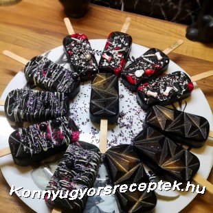 - 100 g fehércsokit gőz felett felolvasztunk, majd 6 csepp fekete ételfestéket cseppentünk bele. Simára keverjük. Kikenjük vele a szilikonos formákat, beledugjuk a pálcikákat és fagyasztóban pár perc alatt keményre fagyasztjuk. Amikor megdermedt, browniet nyomkodunk bele, elsimítjuk egyenletesen, pár perc fagyasztás, majd szépen befedjük a maradék csokival és mehet vissza a fagyasztóba fél órára. Amikor megdermedt, kivesszük és ételcsillámot fújunk rá.