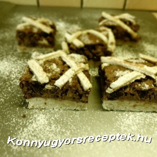 4.Hűtőből kivesszük a tésztát egy darabkát a sütemény tetejére a rácsnak félreteszünk belőle.Egy 23*32 cm-es tepsit kivajazunk,lisztezünk.Lisztezett deszkán kinyújtjuk a tésztát és a tepsibe rakjuk.Ráhalmozzuk a masszát és a megmaradt linzertésztából rácsot rakunk rá amit tojásfehérjével lekenünk.