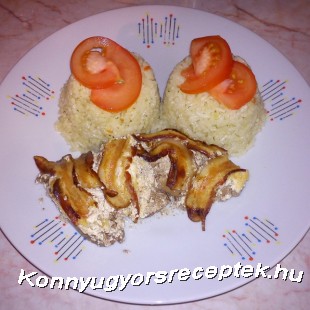Tetejére helyezzük a szeletelt bacon szalonnát úgy, hogy kissé fedjék egymást, majd előmelegített sütőben 20-25 perc alatt készre sütjük. Melegen párolt rizzsel vagy burgonyapürével tálaljuk.