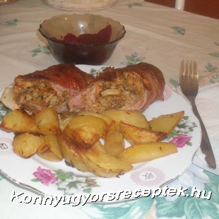 A kockára vágott hagymát kevés zsiradékon megdinszteljük a szeletekre vágott gombával együtt. Összekeverjük a megáztatott, és kinyomkodott zsemlével sózzuk, borsozzuk. Ízesítjük majorannával, kevés pirospaprikával, összedolgozzuk a tojással. Kihűtjük. A húst vékonyra kiverjük, sózzuk, borsozzuk, megszórjuk a fűszerkeverékkel. .Közepére halmozzuk a gombás tölteléket, feltekerjük, majd körbetekerjük bacon szalonnával. A krumplit nagyobb hasábokra vágjuk, egy tálban összeforgatjuk egy kevés olajjal, köménymaggal, sült krumpli fűszersóval. A hústekercseket kicsit olajozott tepsibe fektetjük, melléöntjük a fűszeres krumplit. Fóliával letakarjuk, és 220 C fokos sütőben puhára pároljuk. ( kb. 1 óra) A fóliát levesszük, még kb. 30 percig sütjük, szép pirosra sütjük. Savanyúsággal tálaljuk.