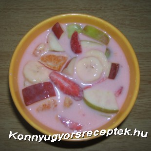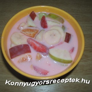 Majd a pudingos tejet ráöntjük a gyümölcsökre és jól lehűtve tálaljuk!