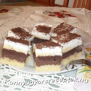 A tésztához 4 tojást keményre felverünk elektromos habverővel 4 evőkanál cukorral, majd beleforgatjuk óvatosan a lisztet, melybe előzőleg belekevertünk fél csomag sütőport. Egy 22 × 38 cm-es tepsit sütőpapírral kibélelünk, majd belesimítjuk a masszát. 180°C-ra előmelegített sütőben tűpróbáig sütjük, majd kihűtjük. A maradék hozzávalókból egy ugyanekkora lapot sütünk, csak kakaóporral, majd ezt is kihűtjük.