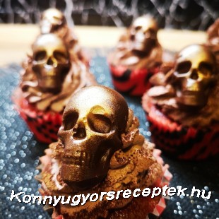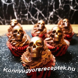 5. A habtejszínhez 6 ek kakaóport keverünk, felverjük, csillagvégű habzsákból halmokat nyomunk a muffinok tetejére. A koponyás formákba 2-2-t fújunk a Lüszter porból, majd olvasztott csokoládét kanalazunk bele és fagyasztóba téve hagyjuk teljesen megdermedni. Amikor elkészült, a kakaós habok tetejébe nyomunk egyet-egyet.
