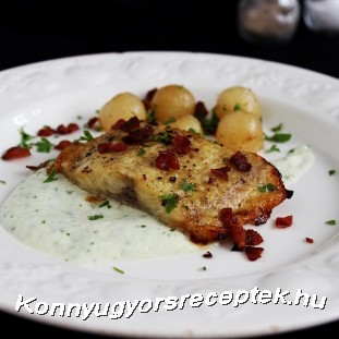 Tálaláskor kanalazzuk a tányérra a karalábékrémet, majd helyezzük rá a halszeletet. Ezután tegyük mellé a sült karalábét, és szórjuk meg a ropogósra sült baconnel, majd úgy kínáljuk.