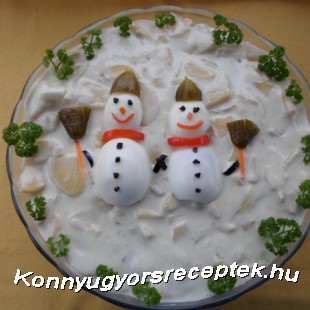 A főtt tojásokat kettévágjuk, hóember alakot formálunk belőlük.