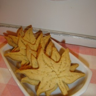 2. Ezután lisztezett deszkán még átgyúrjuk és kb.3 mm. vastagra nyújtjuk.Juharlevélre emlékeztető formával kiszúrjuk.A levelek erezetét éles késsel megrajzoljuk.