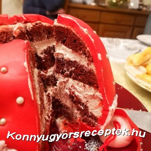 6. A piros fondant keményítővel hintett szilikon lapon kör alakban kinyújtjuk, majd a szilikonról finoman a félgömb piskótánkra borítjuk.
