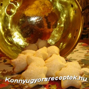 4.Még forrón a tetejüket felvert tojásfehérjével lekenjük és kristálycukorba hempergetjük. Ebből az adagból kb.80 db. csillag lesz.