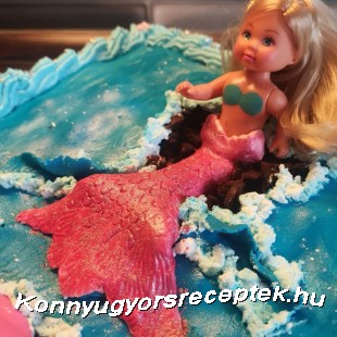 10. A hableány figura farkához kinyújtjuk a maradék fondantot, vágjunk ki belőle két egyforma lapos sellőfarok mintát, késsel mintázzuk meg. Egy kis csészében egy ek rózsaszín Fractal csillámot keverjünk el egy kk vízzel és ecsettel kenjük meg vele mindkét sellőfarok minta egy-egy oldalát. Ha rászáradt, egyik felét a sellő csipő magasságától alulra, másikat felülre helyezzük, majd felülről hajtsuk hátra rajta a fondantot és simítsuk el.