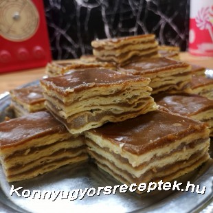 5. A még meleg lapokat rétegezzük a forró krémmel, a legfelső lapra nem kenünk még. Letakarjuk tiszta konyharuhával őket és teszünk a tetejére valami nehezet, én egy tepsi méretű iratokkal teli dobozt tettem rá. Kb 4 órán át hagyjuk így.