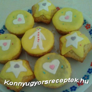 Amikor megsült a muffin, amíg hűl, addig egy nylont lerakok az asztalra, ezt kicsit megszórom porcukorral, erre rárakom a marcipánmasszát, majd ennek a tetejét is megszórom, erre pedig rárakok egy másik nylont, s nyújtófa segítségével kinyújtom 1-2 mm-es vastagságúra. Én pohár segítségével 6 db sárgát, 6 db fehéret kiszaggattam.