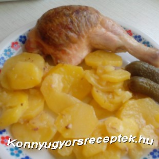 Fontos félidőben kivenni a tepsit és újra megszurkálni a csirkecombokat, nehogy kidurranjon, s utána megfordítani azaz a tepsi belső oldalát kívülre rakni, hogy egyformán átsüljön a hús és a krumpli is.