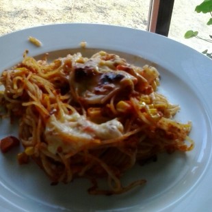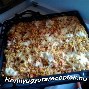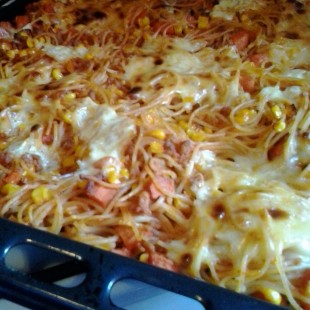 Sós vízben kifőzzük a spagetti tésztát és összekeverjük a hússal, és tepsibe öntjük az egészet. Sajttal megszórjuk a tetejét és 200 C-os sütőben pirosra sütjük.