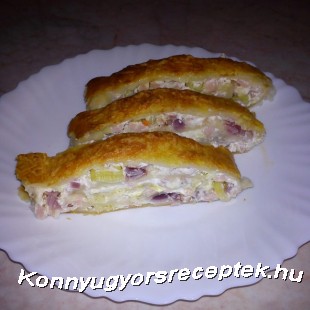 A tejfölt elkeverjük az átpréselt fokhagymával, a füstölt sonkát pedig felkockázzuk. A csemegehagymát megmossuk és felkarikázzuk, a lila hagymát pedig apróra vágjuk. A leveles tésztát lisztezett deszkán vékonyra nyújtjuk, majd a fokhagymás tejföllel egyenletesen megkenjük. Rászórjuk a kockákra vágott sonkát, a karikára vágott csemegehagymát, az apróra vágott lila hagymát, ételízesítővel meghintjük, majd ráreszeljük a sajtot. Óvatosan feltekerjük, végeit benyomkodjuk. Tetejét megkenjük tojássárgájával, késsel bevagdossuk a szeletek helyét, majd megszórjuk sajttal. Előmelegített sütőben aranybarnára sütjük!