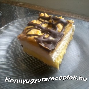 4. Az egyik megsütött tésztalapot megkenjük pudingos krémmel majd a habbal, végül rátesszük a másik lapot. A tetejére olvasztott csokit vagy porcukrot tehetünk.