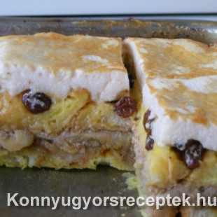 A maradék tojásos tejjel egyenletesen meglocsoljuk a tetejét. Kb.180 fokon 20 percig sütjük, ezután kivesszük és kis cukorral és baracklekvárral felvert tojások fehérjét a tetejére kenjük. A tepsit visszatesszük a sütőbe és kisebb lángon tovább sütjük amíg a teteje elkezd egy kicsit barnulni.