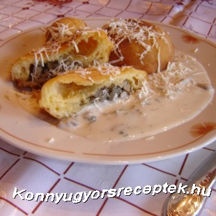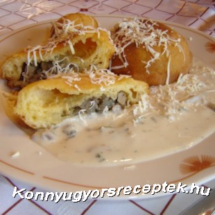 A kisült fánkokat tányérra rakjuk, leöntjük a gombamártással, és reszelt füstölt sajttal megszórjuk.