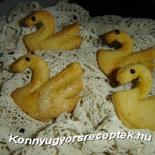 4.A hűtőből kivéve lisztezett deszkán kb.2-3 mm-es vastagságúra kinyújtjuk a tésztát. Egy 6 cm átmérőjű kiszúróval korongokat szaggatunk,majd félbe hajtjuk.Egy éles kés segítségével a félkör egyenes részénél háromnegyed részig bevágjuk a tésztát.Ebből formázzuk meg a nyakat,majd még két bevágást ejtünk.amiből a szárnyakat formázzuk.Egyiket kb. a feléig,másikat egynegyed részig vágjuk.Mindegyik tésztát hattyúvá próbáljuk formázni.