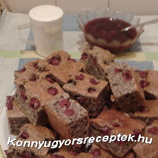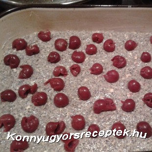 A tepsit kikenjük fagyos zsírral,ki lisztezzük ,és beleöntjük a tésztát ,elsimítjuk..A tetejét megszórjuk magozott meggyel.