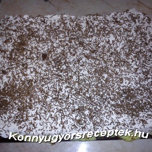 A forró masszát vizezett tálcára tesszük, amin egyenletesen eloszlatjuk, majd kihűtjük. Ez idő alatt a pudingport 6 ek. cukorral és 1 liter tejjel felfőzzük, majd kicsit hűtjük, és a meggyes masszára kenjük.