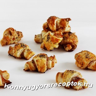 A megszórt tésztacikkekre ezután helyezzünk rá egy-egy félbevágott baconszeletet, majd tekerjük fel.