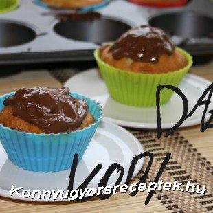 A muffin kapszlikat úgy töltsük meg, hogy 1 evőkanál tészta, arra egy kiskanál mogyorókrémet tegyünk, majd ismét 1 evőkanál tészta. Nagyjából háromnegyedig töltse ki a formát.