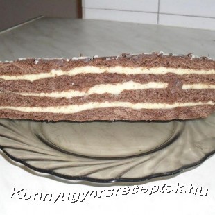 A lisztben elmorzsoljuk a Ramát, majd a többi hozzávalóval begyúrjuk a tésztát. Négy részre osztjuk, mindegyiket kinyújtjuk és Ramával bekent közepes méretű tepsi hátán egyesével megsütjük a lapokat 150 fokon kb. 10 perc alatt. A krémhez a tojássárgákat a pudingporral és pici vízzel csomómentesre keverjük, majd lassan hozzáadjuk a többi vizet is. Sűrű krémmé főzzük, majd kihűtjük. Közben a Ramát a cukorral és a vaníliás cukorral habosra keverjük, majd a kihűlt krémmel összedolgozzuk. A kakaós lapokat megkenjük langyos tejjel és megtöltjük a krémmel úgy, hogy a tetejére is jusson. Csokoládét reszelünk rá. Csak másnap szeletelhető.
